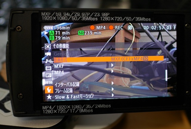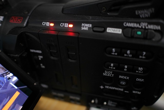 MXFフォーマットのCFスロットは2つあるのでリレー録画も出来るし同時録画するモードもあります。これは同時に録画しているので赤く点灯しているところ。