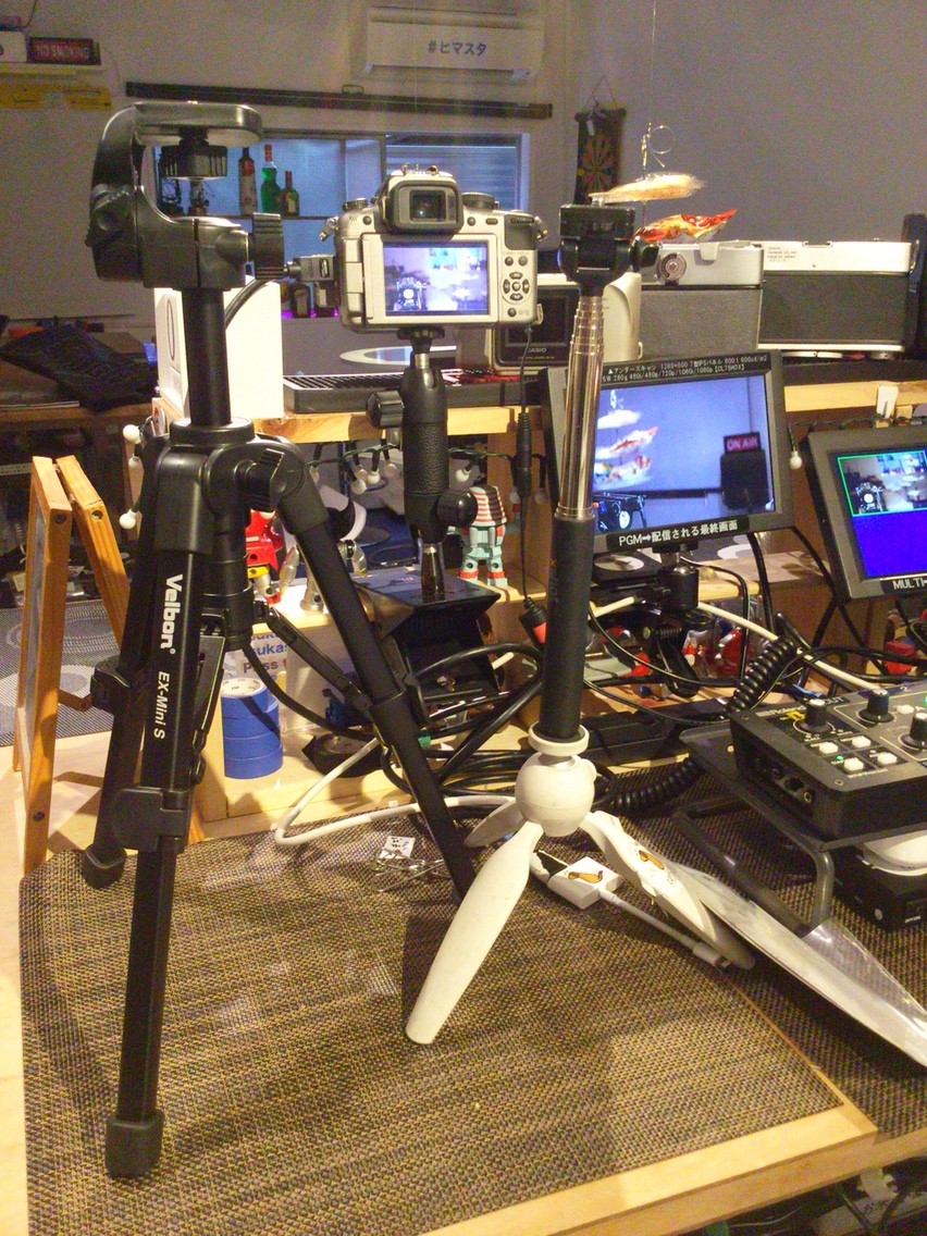 これまではManfrottoの卓上三脚に自撮り棒という強引なスタイルでGH2を固定していたんですがさすがにグラグラするわけです。そこで今回のリニューアルというわけです。クリップ三脚も試したんだけど棚ごと倒れそうな感じもするので場所は取るけどミニ三脚でというわけです。