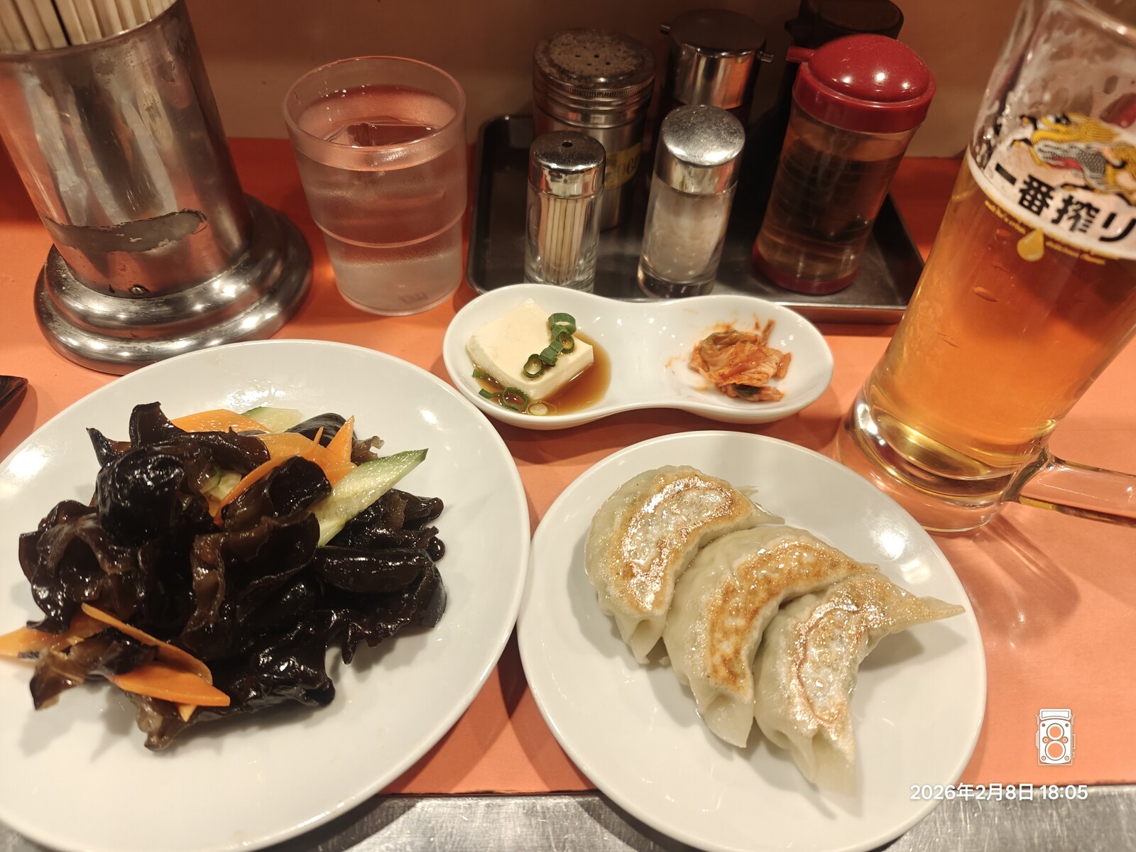 くぅ〜!いいですねぇ〜!生ビールに餃子3個、ミニ豆腐とキムチとキクラゲです!