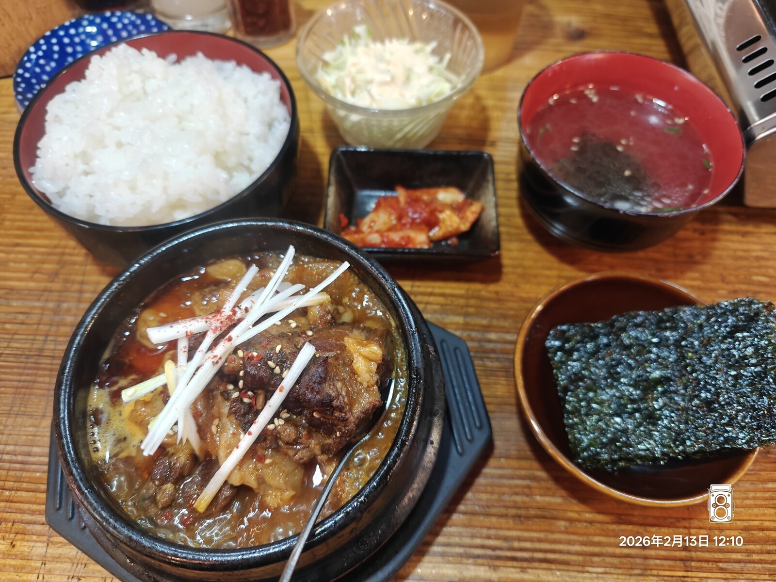 大盛りもオッケーなごはんにサラダ、キムチ、スープ、韓国のりがつくお得なセット!しかも煮込みが本当にグツグツで肉の量がスゴいです!
