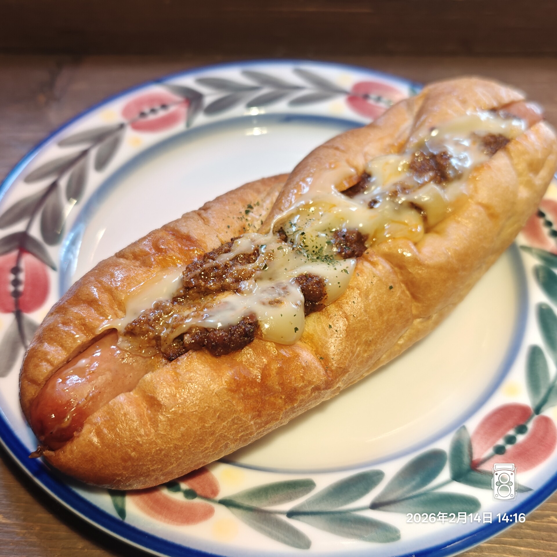 スパイシータコスドッグの方はフランスパン風でソーセージにチリソースとメルティングチーズです。