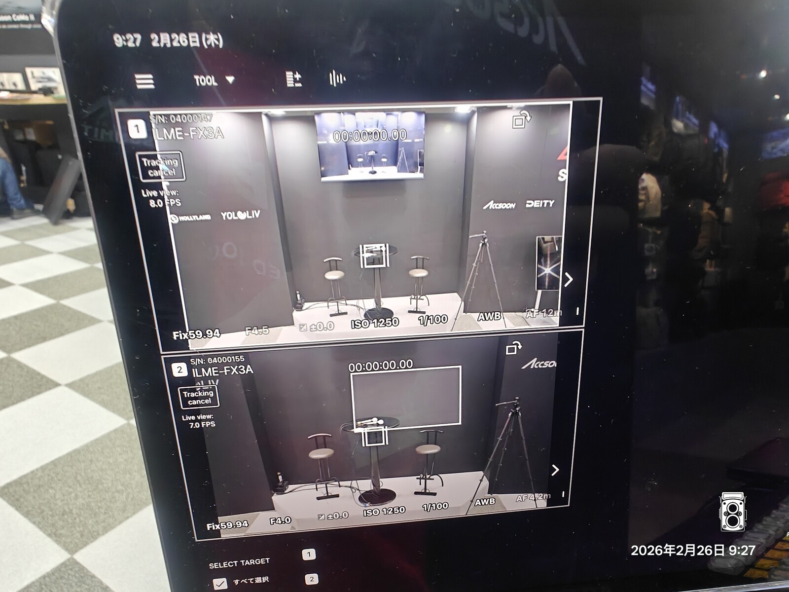 上がLANを通じて送られてくるプレビュー画面でコマ数は可変。だいたい8から30fpsくらい。下にある小さな四角が登録アングルでタップすると瞬時にHDMIアウトからの画角が切り替わる。ディレイやブラックアウトによる瞬断はないので本線として問題なく使える。