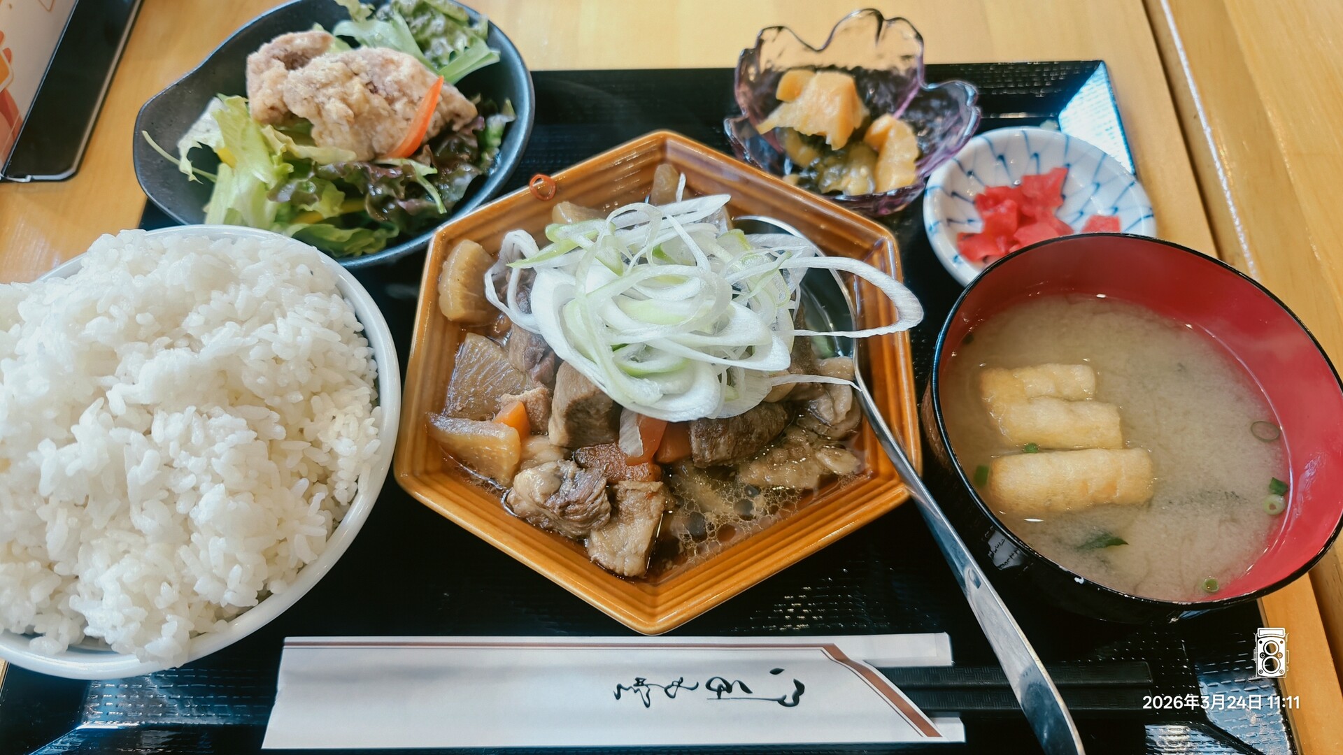 胃に優しそうな牛すじ煮込みランチにしてみました!これ牛すじという名前だけど角煮?くらいの勢いで肉が入っていて実に満足度が高かったです!唐揚げが1個ついてるのも嬉しい!みそ汁だけちょっとあれかなという感じでしたがライス大盛り無料だしお腹いっぱいにチャージして午後一からの仕事に挑めます!