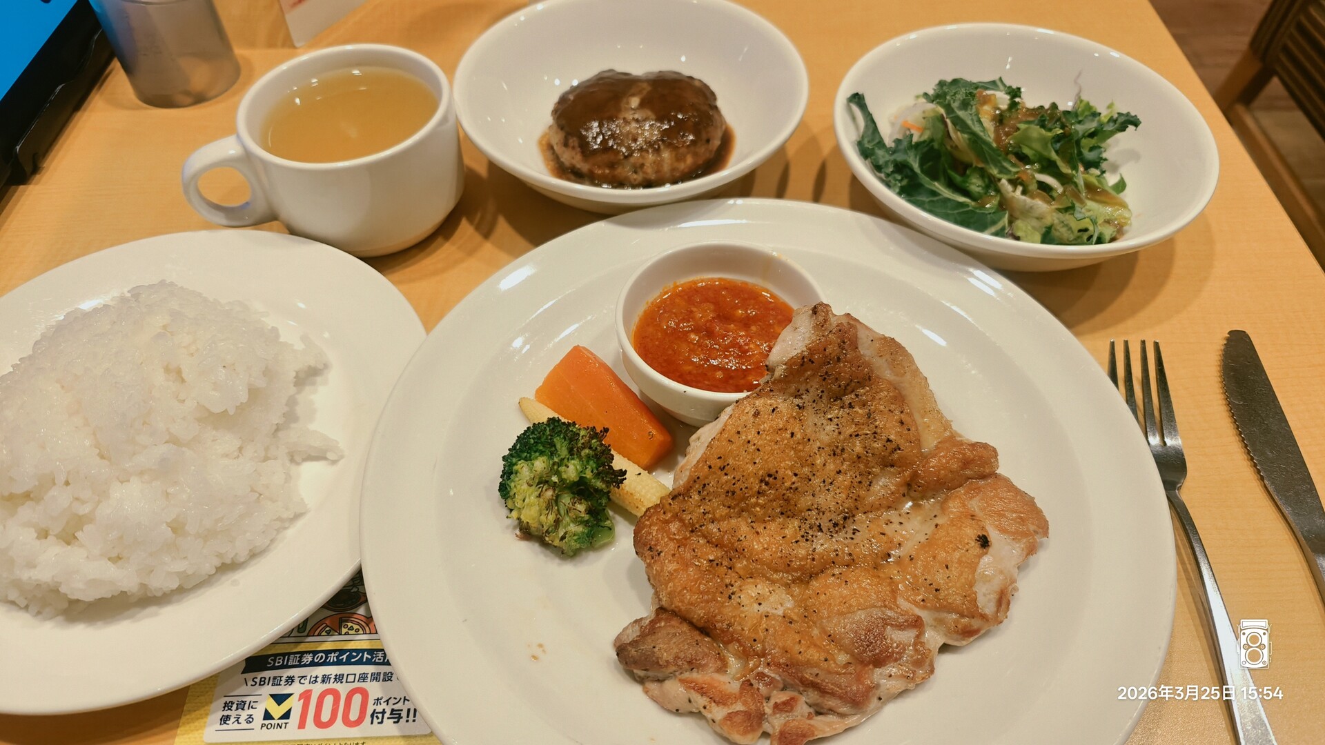 ジューシー若鶏グリルの大盛りライス付きをガーリックソースで!これが879円!セットサラダ165円を追加!さらにミニチーズINハンバーグ252円がどのくらいミニなのか気になったのでそれも追加!そのかわりドリンクバーはなしにしました。なんなら昼呑みにしてもいいからね!