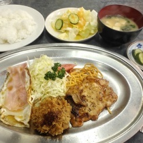 高円寺キッチンフジ「本日の定食:ポークソテー+ベーコンエッグ+メンチカツ」900円(2026年3月)