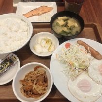 松屋「ソーセージエッグW定食の牛小皿+炙り焼鮭+みそ汁豆腐追加」860円(2026年3月)